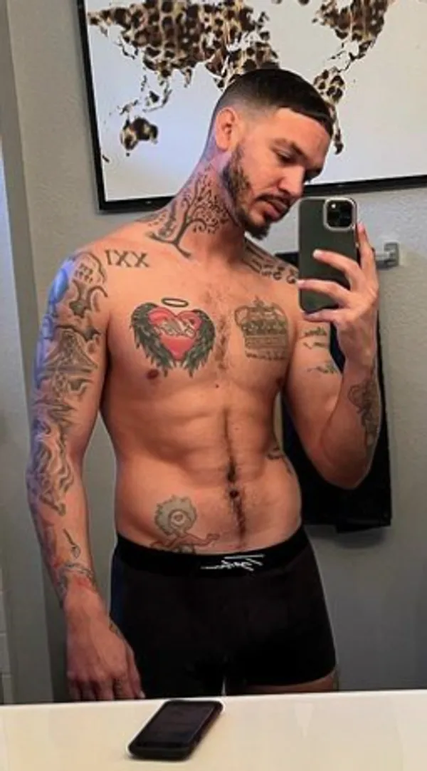 left pectoral: "Ellen", left side of lower abdomen: Red cartoon character with green hair, left side of upper chest: "XXI", left upper arm: Full sleeve, right arm: Full sleeve, right pectoral: Crown, right side of lower abdomen: Stick figures having sex doggy-style, right trapezius: Music notes and script