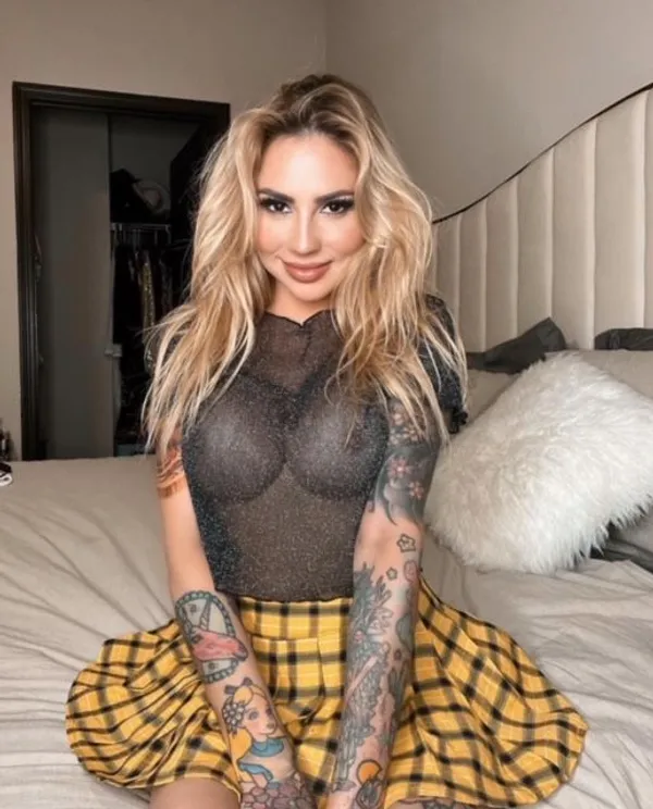 Upper back, Full sleeve left arm and hand, Two cherries on right collarbone, Right shoulder/upper arm, Right forearm and hand, Fingers of right hand, '666' right side of lower abdomen, Design featuring a rose, animal and blue mirror/portal on front of left thigh, Dog on back of left thigh, Cat on left calf, Back of left ankle