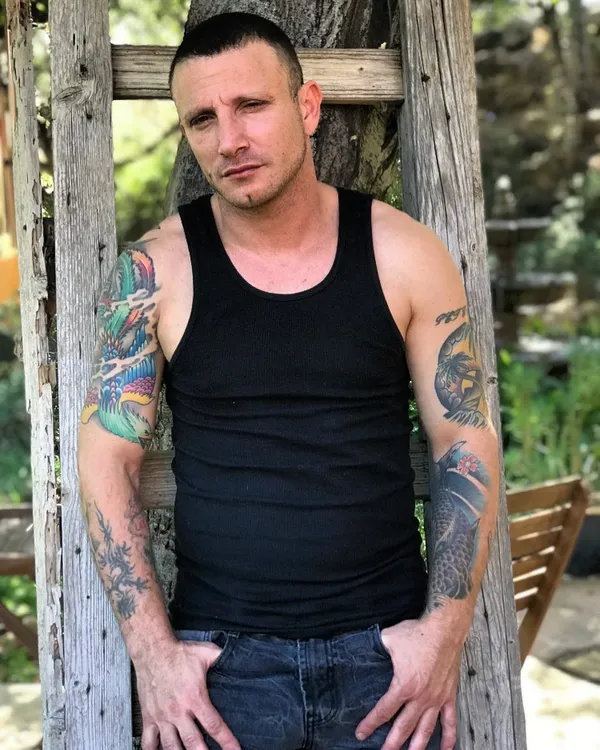 Left arm: Script: "Pete-Rob", sunset with palm trees, Left forearm: Script: "Tristan", Right arm: Mythical bird, Right forearm: Dragon, royal flush with "Las Vegas", Upper back: Script: "Heavenly Soulja"
