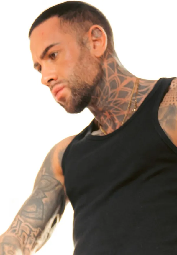 above navel: "1992", Center of lower abdomen, Full sleeve left arm, Full sleeve right arm, Left side: skull, Neck, Right hip, Upper chest and pectorals